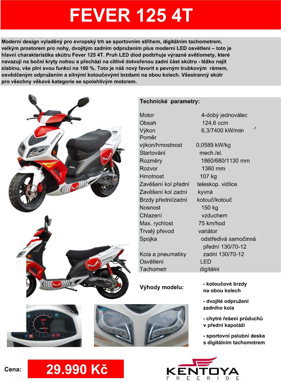 Moderní design vyladěný pro evropský trh se sportovním střihem, digitálním tachometrem, velkým prostorem pro nohy, dvojitým zadním odpružením plus moderní LED osvětlení – toto je hlavní charakteristika skútru Fever 125 4T. Pruh LED diod podtrhuje výrazné světlomety, které navazují na boční kryty nohou a přechází na citlivě dotvořenou zadní část skútru - těžko najít slabinu, vše plní svou funkci na 100 %. Toto je náš nový favorit s pevným trubkovým rámem, osvědčeným odpružením a silnými kotoučovými brzdami na obou kolech. Všestranný skútr pro všechny věkové kategorie se spolehlivým motorem.